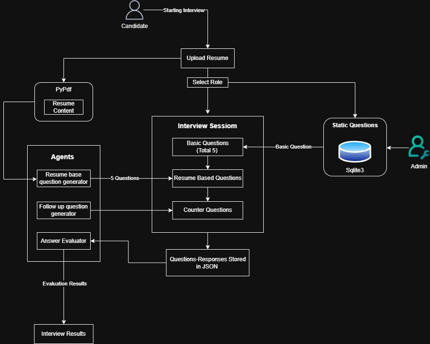 The AI Interview Bot leverages a multi-agent AI framework (CrewAI) to efficiently manage different interview tasks. Each phase is handled by specialized AI agents, ensuring dynamic questioning, intelligent response analysis, and unbiased evaluation. The key components include